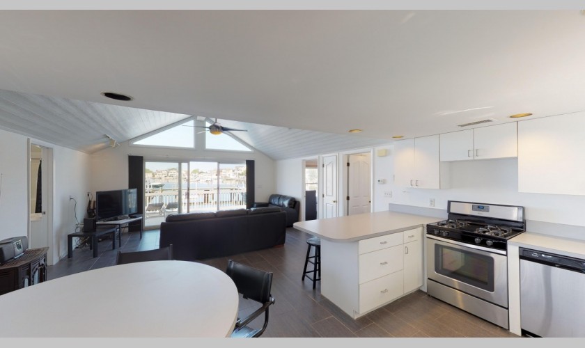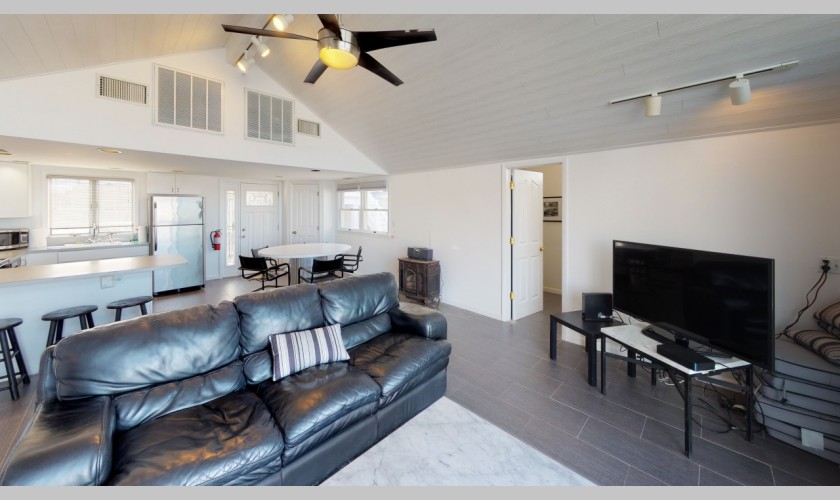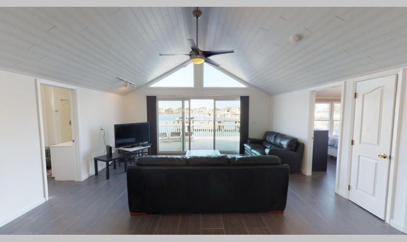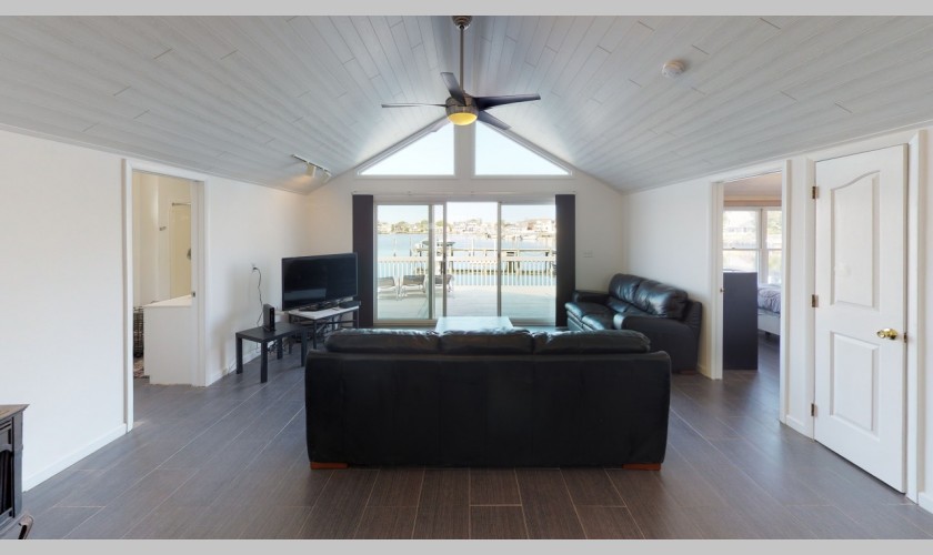 Summer 2024-$2400.00 week - Quaint lakefront! Beautiful sunsets from your back deck overlooking Lake Louise, this California style ranch has 2 bedrooms, 1 bath, vaulted ceilings. 1 block from beach, central a/c, 2 car parking, 3 beach badges.