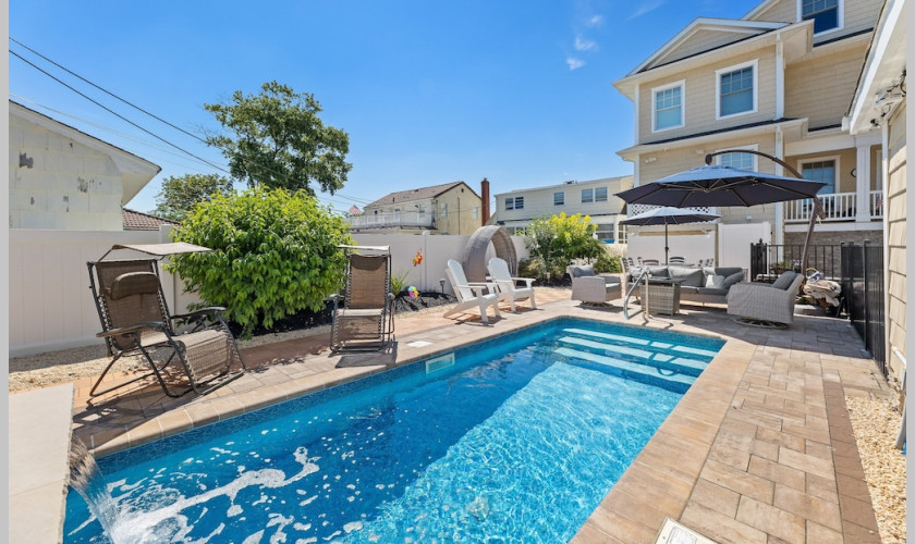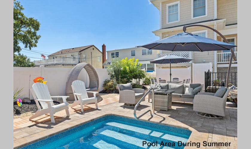 Summer 2025 $16000.00/week for peak weeks. Call for off season rates. Your shore oasis is here. Georgous 3 story 6 bedroom 5 bath home located 1 block from the beach. The pictures tell the story for this beautiful home: chef's kitchen w/island, huge family dining space and a massive living/family room with a 75 inch TV, fireplace and beamed ceilings. Families and extended families can enjoy the salt water pool, inviting back yard and even a 2nd lounge area on the 3rd floor. This property also provides 12 beach badges and ample parking. Mandatory $250.00 cleaning fee and $500.00 refundable security deposit plus $79.00 damage insurance policy on all rentals. Linens, bath and hand towels are included with this premium rental.